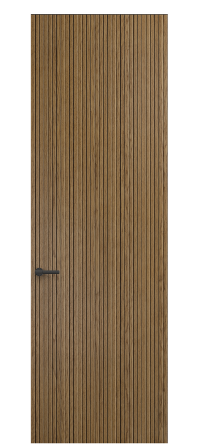 SELECT — коллекция минималистичных дверей с фрезеровкой по натуральному шпону. Рельеф на поверхности полотна создаёт игру света и тени, добавляя пространству динамичности и визуального объёма. Двери SELECT в сочетании со стеновыми панелями и мебельными фасадами, повторяющими лаконичный дизайн, создают единое стилевое решение.